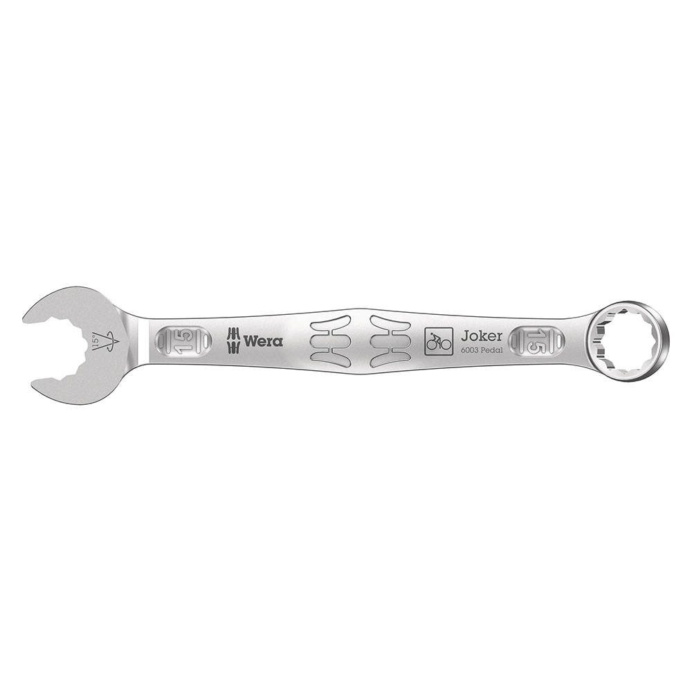 WERA TOOLS JOKER COMBINATION WRENCHES As the installation space becomes increasingly tight during screwdriving, tools are necessary that enable users to work successfully even in such situations. Narrow spaces require additional placement points of the tool. Can spanners be modified so that the placement possibilities of the tool increase? The combination of the 7.5° pivoted mouth and the double hexagon geometry doubles the placement points. A repeated 180° turn of the wrench around the longitudinal axis during screwdriving provides four placement possibilities, and bolts or screw heads can be engaged every 15°. The Joker 6003 with its smart mouth geometry significantly expands the range of uses in confined spaces. The Joker 6003 will automatically find the respective placement point after every turn. The slim yet robust ring side is angled by 15° to the tool axis. The high-quality surface treatment achieves a high and long-lasting corrosion protection. With tool finder "Take it easy": colour coding by size. |