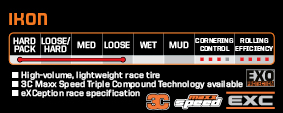 The Ikon is for true racers looking for a true lightweight race tire. With 3C Triple Compound Technology, high-volume casing and a fast rolling tread design, the Ikon provide exemplary performance in all riding conditions. As its name suggests, the Ikon represents all that is true in racing.